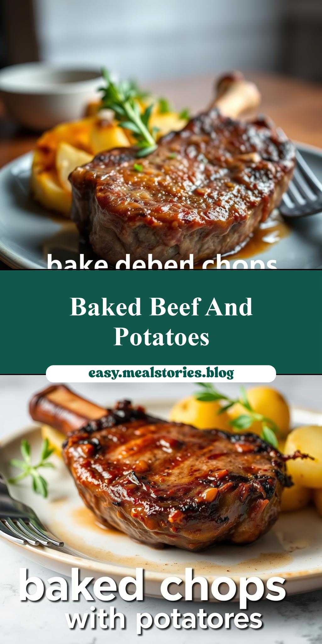 baked beef chops with potatoes in the background and text overlay that reads baked beef chops with potatoes