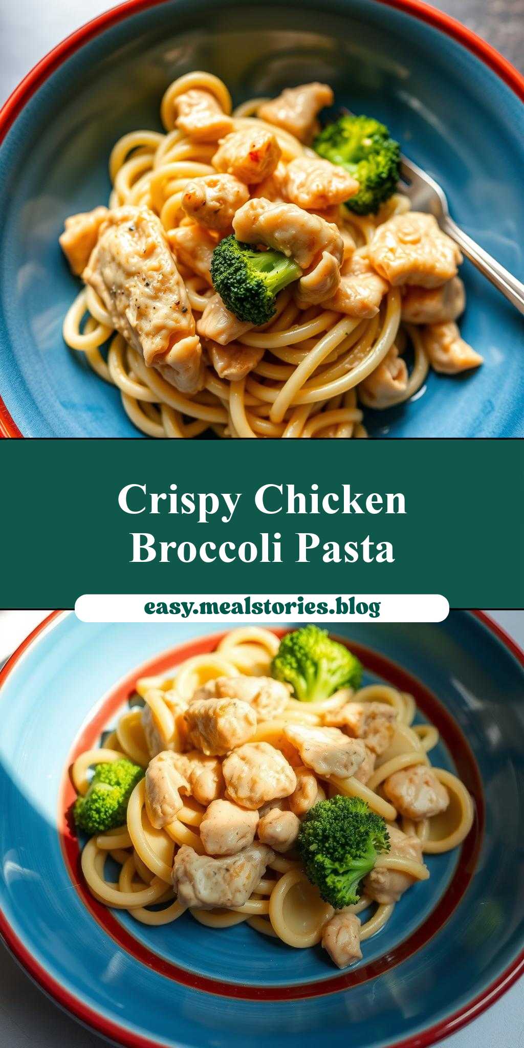 A delicious and easy-to-make pasta dish featuring chicken, broccoli, and a creamy sauce, served in a visually appealing blue bowl with a red border.