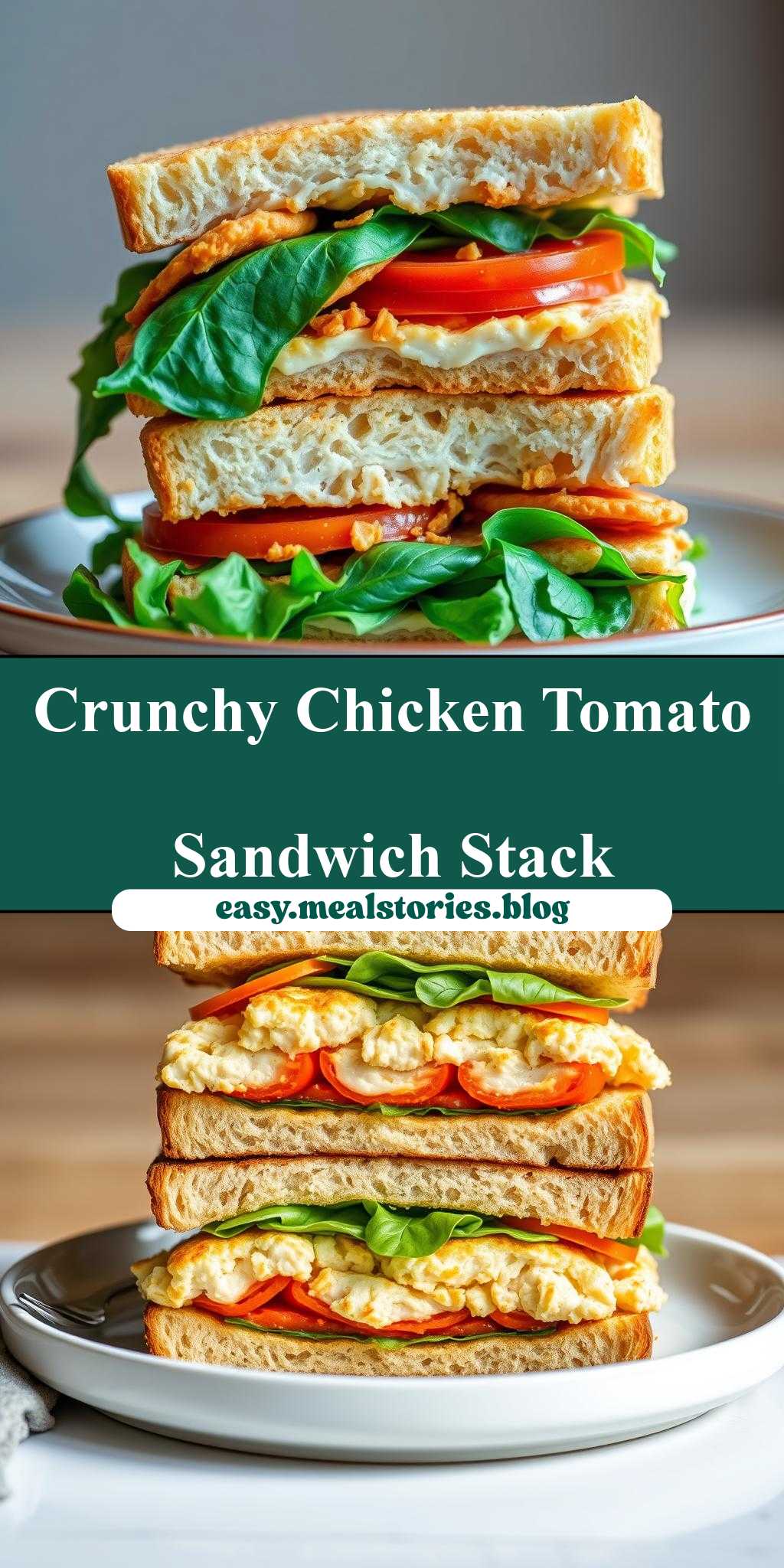 two sandwiches stacked on top of each other with the words crunchy chicken and tomato sandwich recipe