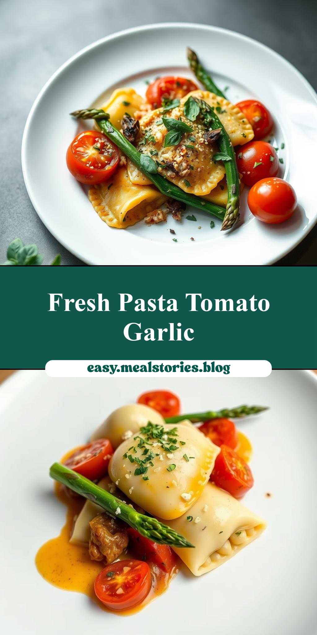 A delicious and elegant dish featuring ravioli, fresh tomatoes, asparagus, garlic, and herbs, perfect for any occasion.