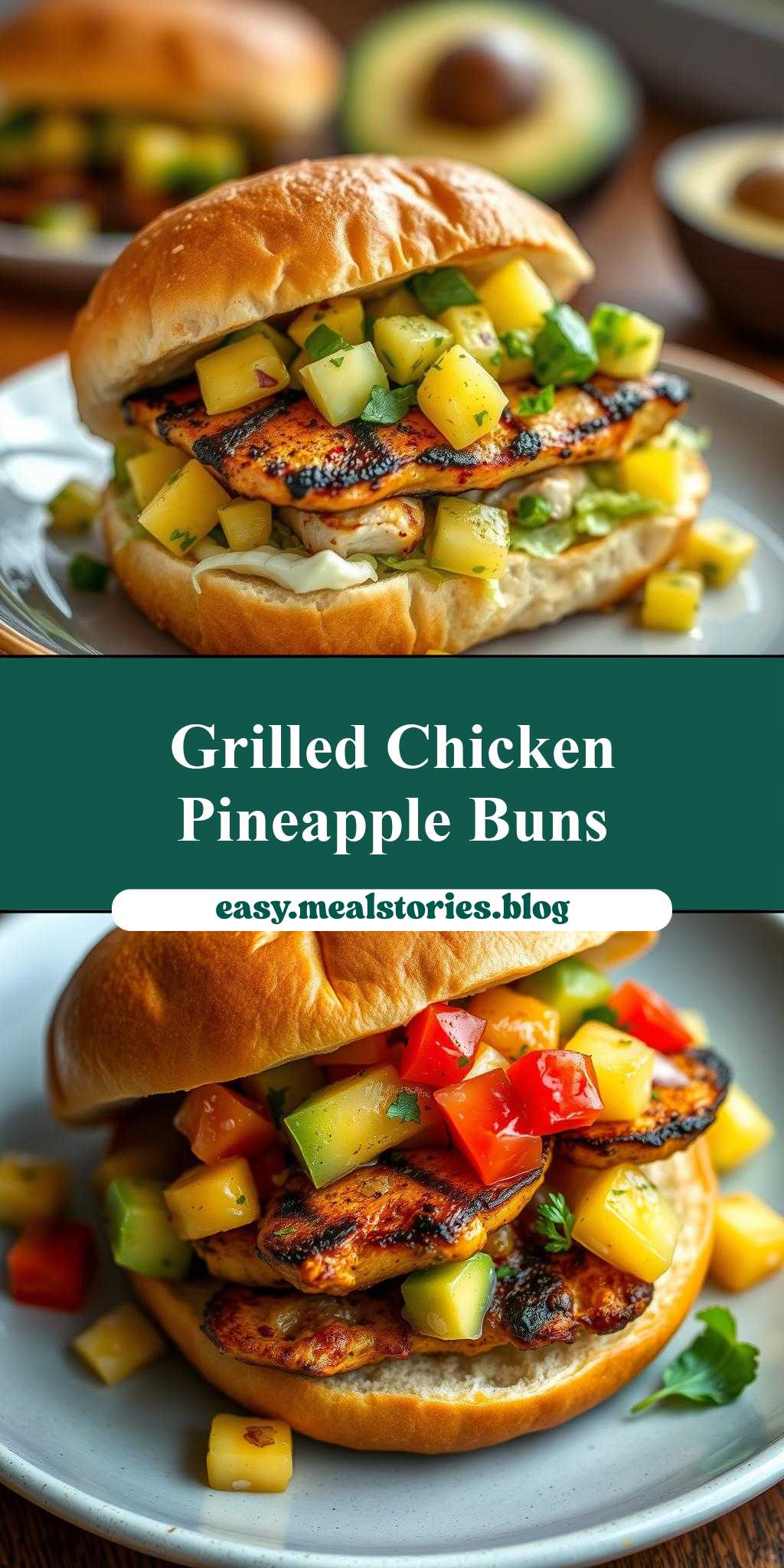 4Assemble the sandwiches by layering the grilled chicken, pineapple salsa, and avocado slices on the toasted buns.