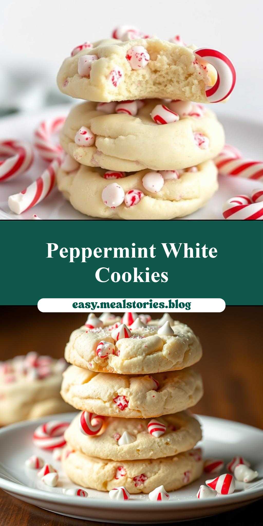 A festive and delicious holiday dessert featuring white chocolate peppermint cheesecake cookies stacked with candy canes.