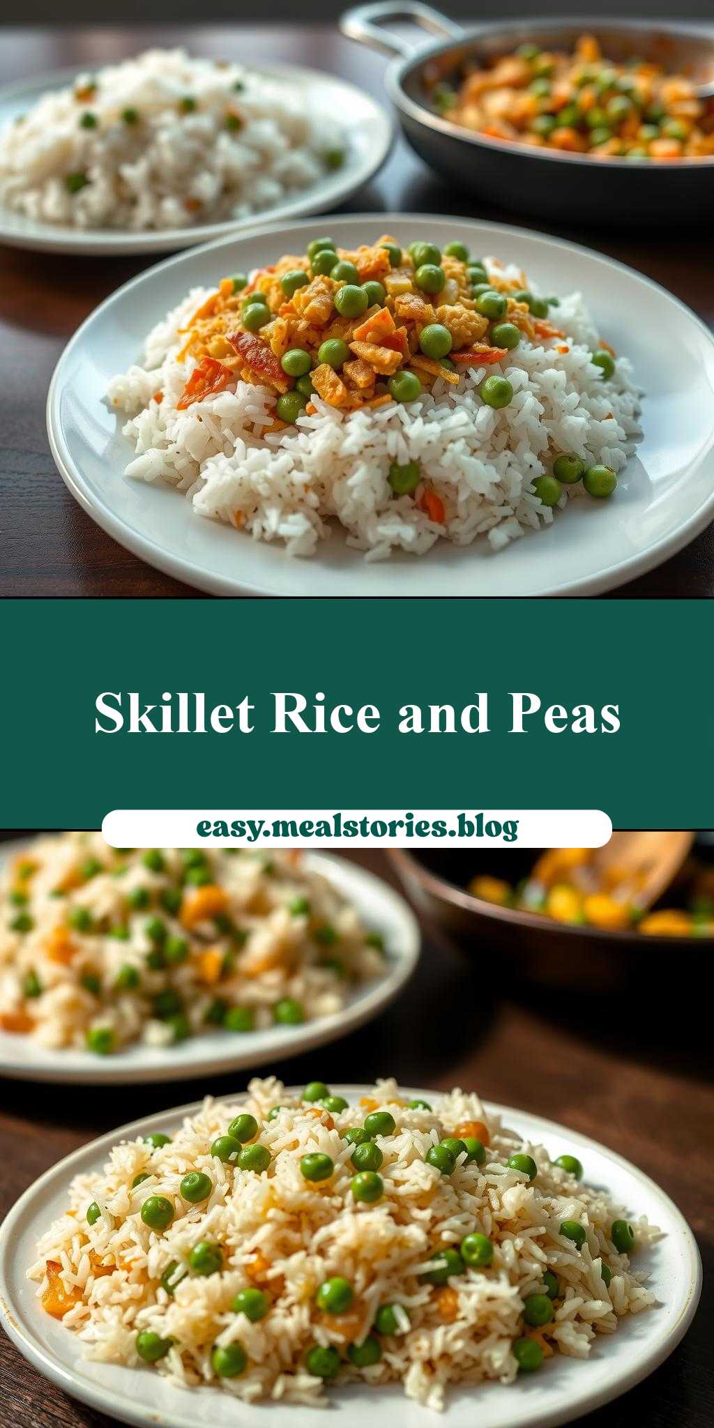 A simple and flavorful dish made by cooking rice and peas in a skillet, perfect for a quick and nutritious meal.