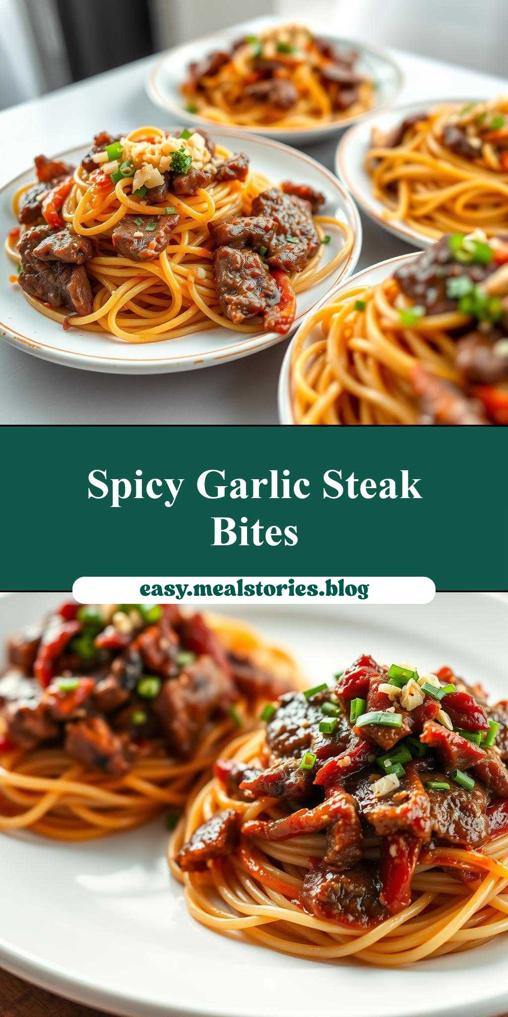 two plates of spaghetti with meat and spicy garlic on top, along with the words sweet and spicy garlic steak