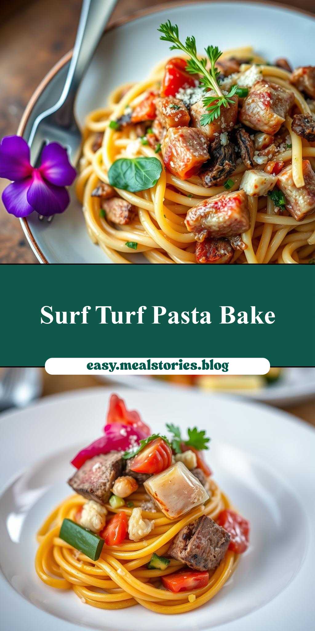 A gourmet pasta dish combining succulent shrimp and tender steak in a rich and creamy sauce, perfect for special occasions or cozy nights in.