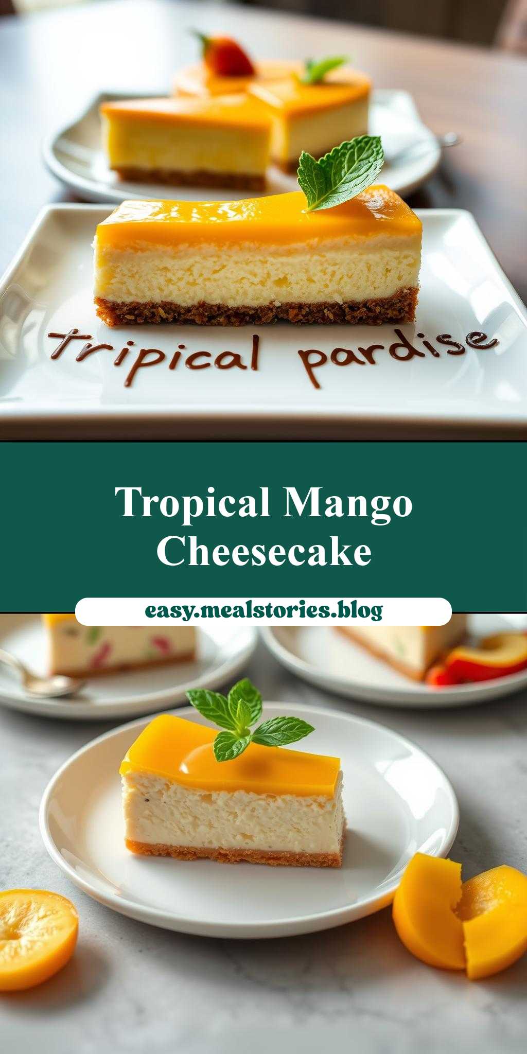 three different types of cheesecakes on plates with the words tropical paradise mango cheesecake